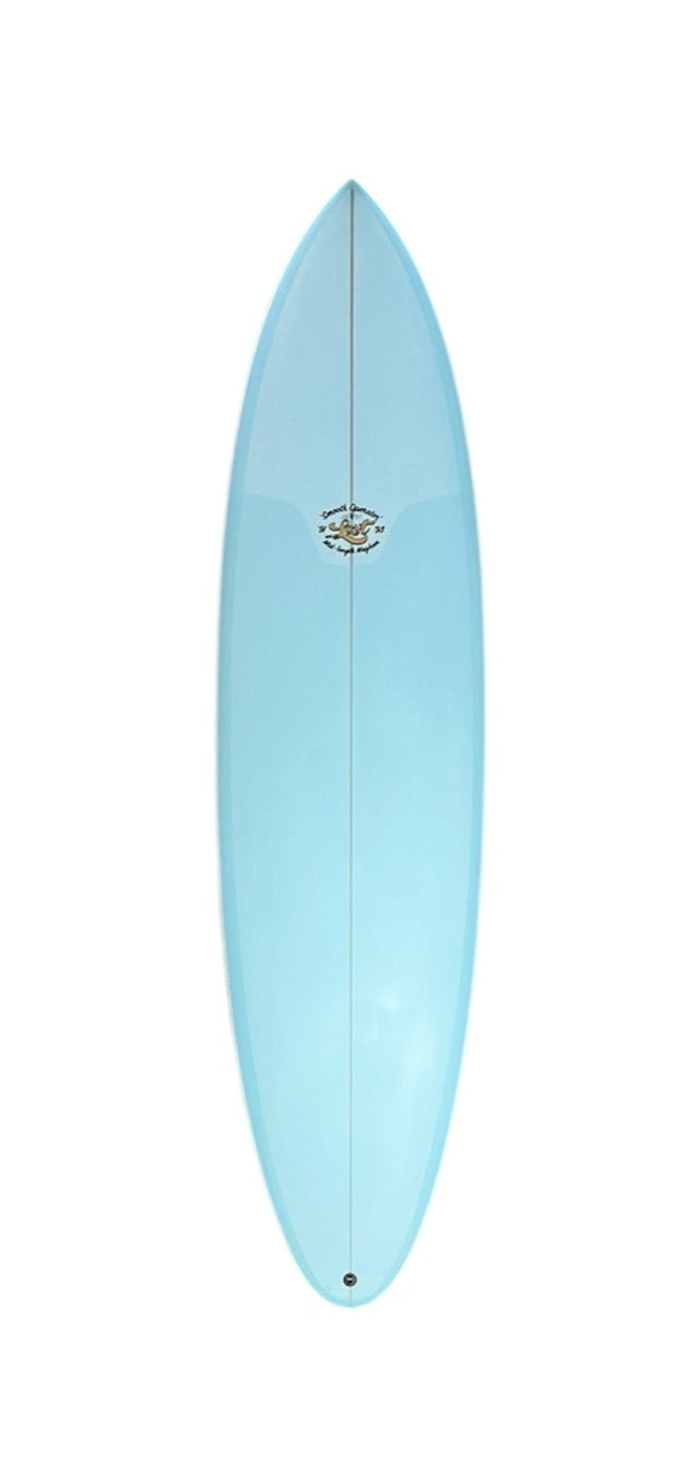 The classic mid-length, double ender. I’ve become more interested in not only designing and building this genre of board, but also inspired to really learn how to ride them. It was sparked by previous dalliances with mid-length, semi-performance boards, like the “Lazy Toy” and “EZ-UP”. These boards, with their Wayne Lynch/Evolution inspired vee bottoms and rounded noses, were forgiving and easy to ride, but essentially glorified fun boards. More recently, we developed the Crowd Killer, more of an over inflated pump and rip stick, with its hyper extended nose rocker and equally aggressive tail rocker. While high volume and performance minded, the Crowd Killer does not possess the effortless glide and horizontal trim of a classic mid length. The SMOOTH OPERATOR does. Built around an exaggeratedly low entry rocker, forward wide point and thickness flow, and a nose and tail that measure the same width at both 12” and 24”, the SMOOTH OPERATOR paddles and glides like nothing ever adorned with a …Lost or Mayhem logo. That’s not to say it doesn’t turn though!
